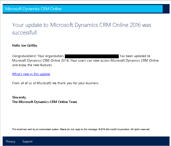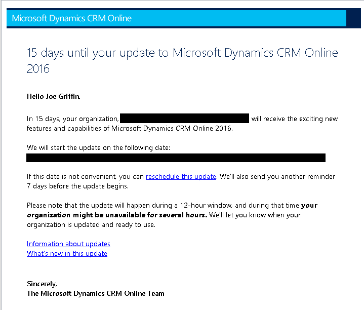 These will be sent to all CRM Administrators for your instance from the e-mail address [email protected], so make sure you check your spam filter settings. The e-mail will look something like this: